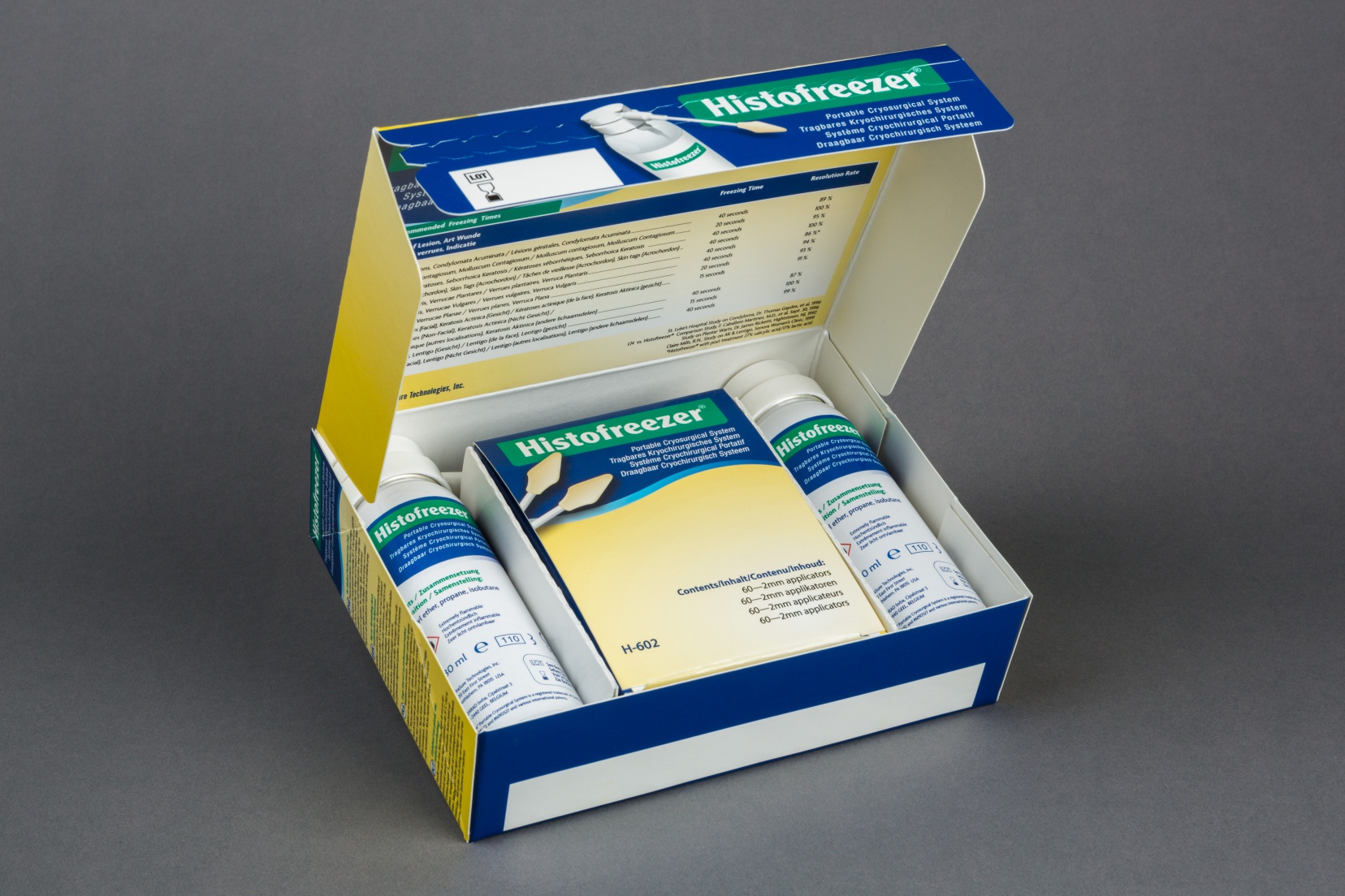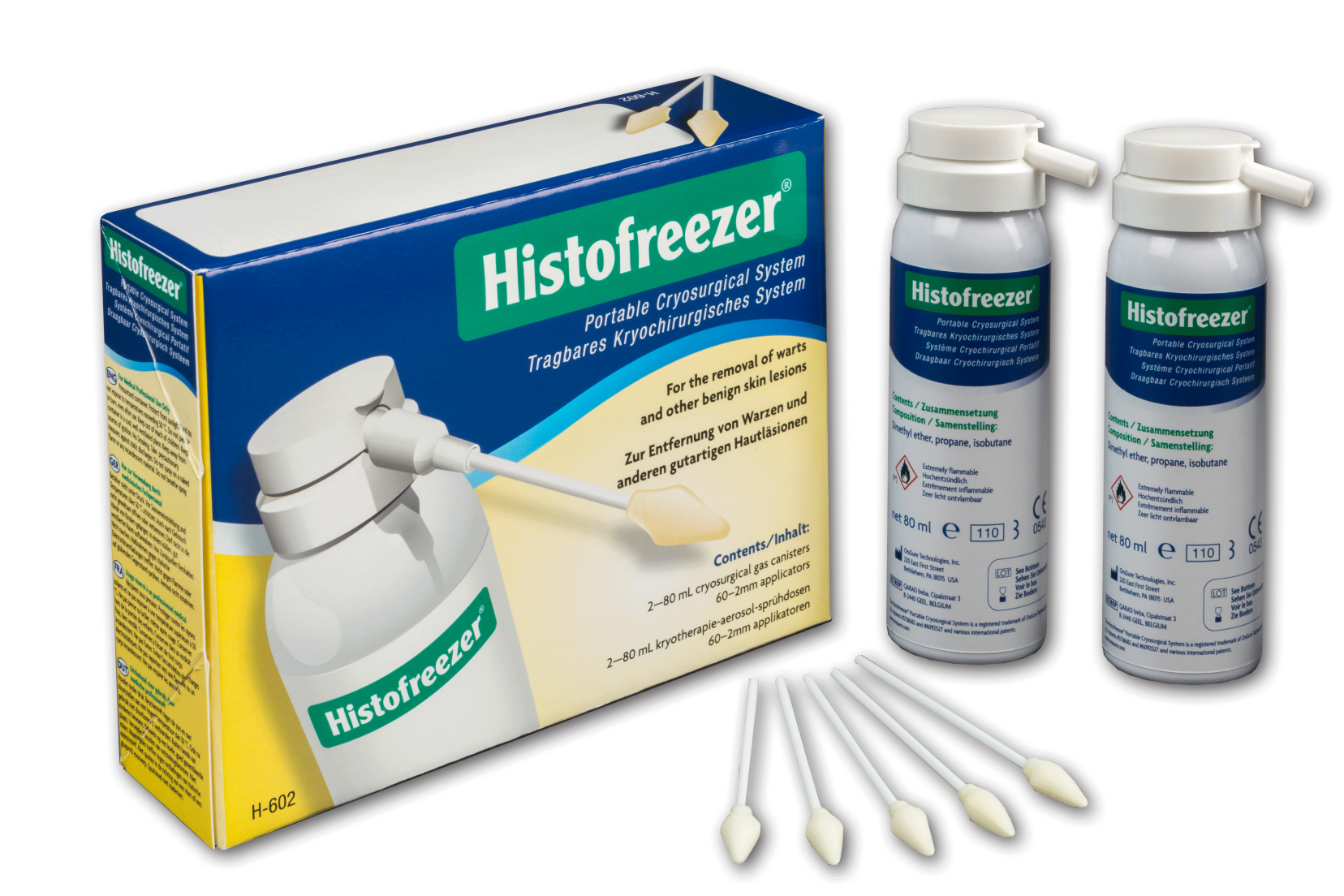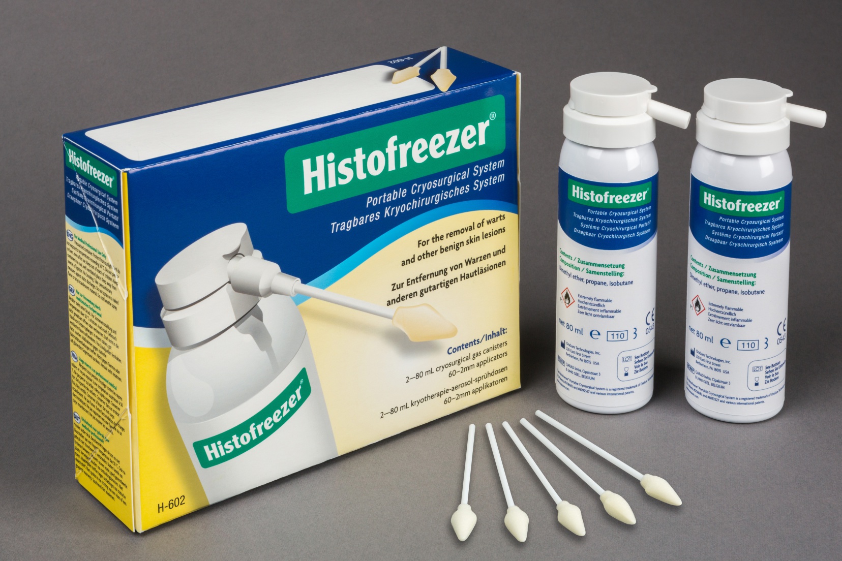 Histofreezer MIX inneholder 2x80ml, samt 60 stk 2mm applikatorer.
